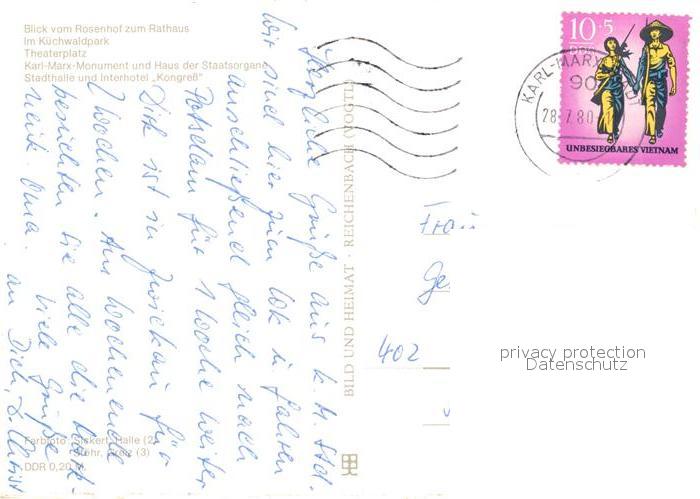73039805 alte Postkarte Karl-Marx-Stadt Rosenhof Rathaus Theaterplatz Karl Marx Monument Stadthalle Interhotel Kongress postalisch gelaufen Erhaltung siehe scans [WerneD78] KatCode: 11110014161000