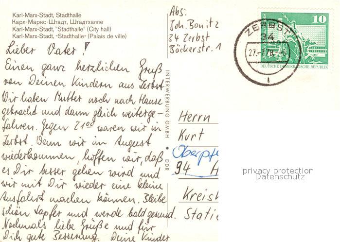 73092817 alte Postkarte Karl-Marx-Stadt Stadthalle postalisch gelaufen Erhaltung siehe scans [PaolaD17] KatCode: 11110014161000