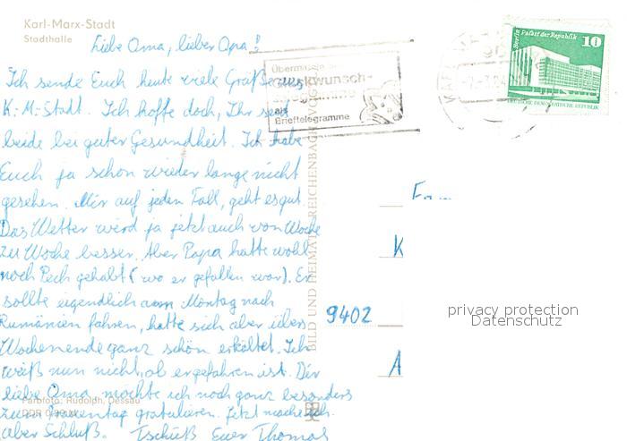 73090260 alte Postkarte Karl-Marx-Stadt Stadthalle postalisch gelaufen Erhaltung siehe scans [PaolaD17] KatCode: 11110014161000