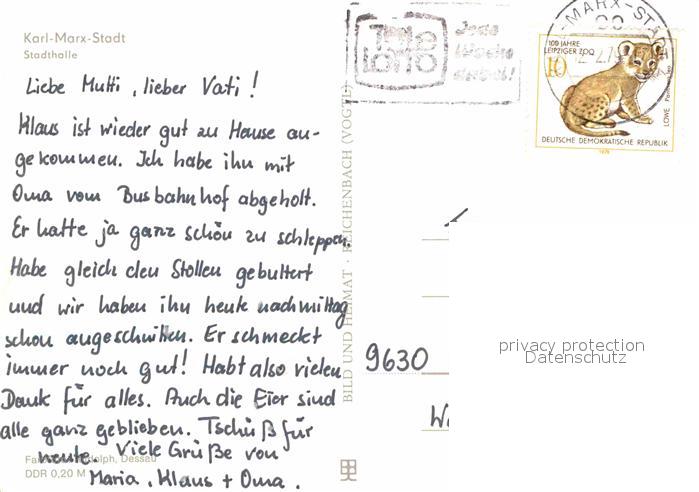 72803590 alte Postkarte Karl-Marx-Stadt Stadthalle postalisch gelaufen Erhaltung siehe scans [FriedD77] KatCode: 11110014161000