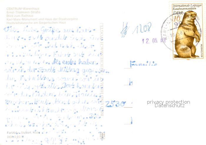 73295256 alte Postkarte Karl-Marx-Stadt Thaelmann Strasse Rathaus Karl Marx Monument Hochzeitskutsche am Siegertschen Haus postalisch gelaufen Erhaltung siehe scans [WerneD78] KatCode: 11110014161000