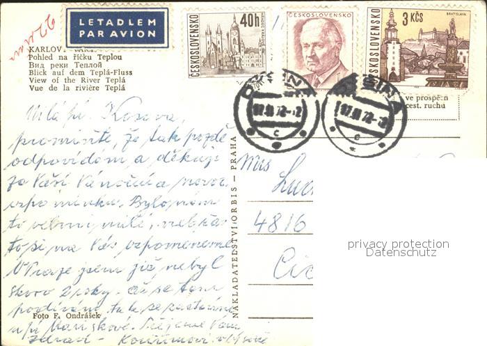 old postcard Karlov Mala Moravka Blick auf den Fluss Teplà postalisch gelaufen Erhaltung siehe scans