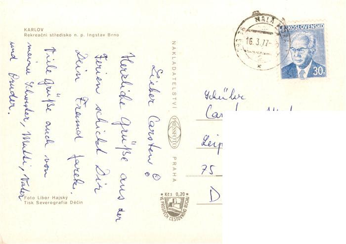 73905391 old postcard Karlov Mala Moravka CZ Recreacni stredisko n p Ingstav Brno postalisch gelaufen Erhaltung siehe scans [FriedD77] KatCode: 11520