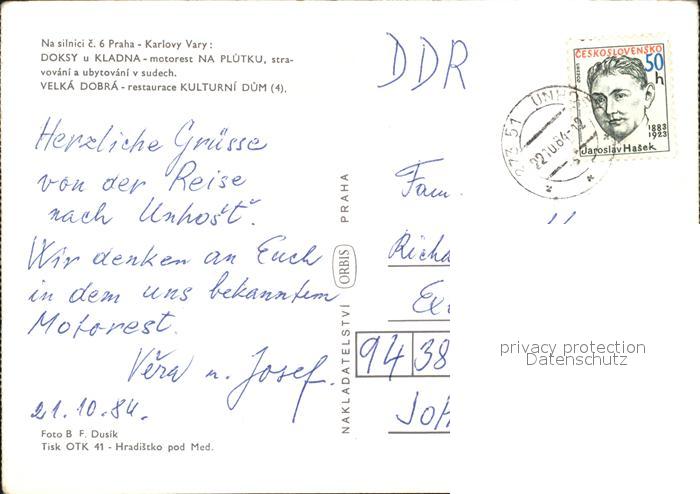old postcard Karlovy Vary Doksy u Kladna motorest Na Plutku Velka Dobra restaurace Kulturni Dum postalisch gelaufen Erhaltung siehe scans