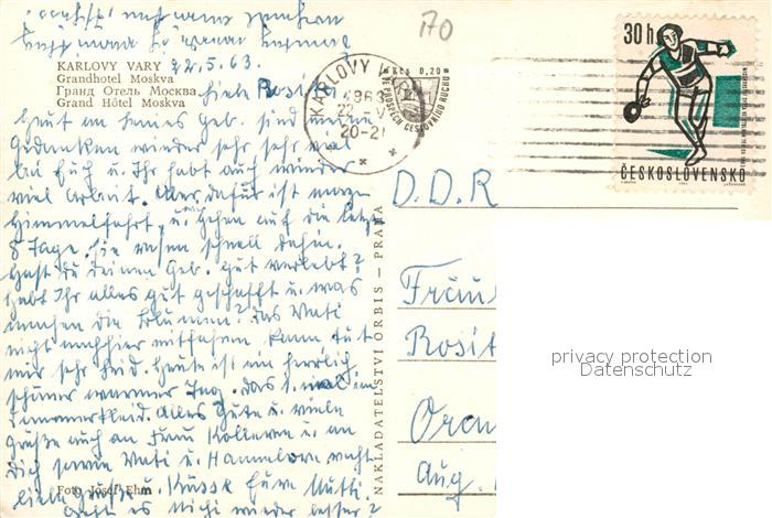 13526532 old postcard Karlovy Vary Grandhotel Moskva Bar postalisch gelaufen Erhaltung siehe scans [WerneD78] KatCode: 11520