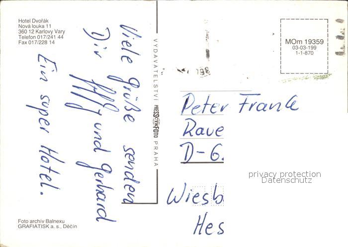 old postcard Karlovy Vary Hotel Dvorak postalisch gelaufen Erhaltung siehe scans [LiesaD40]