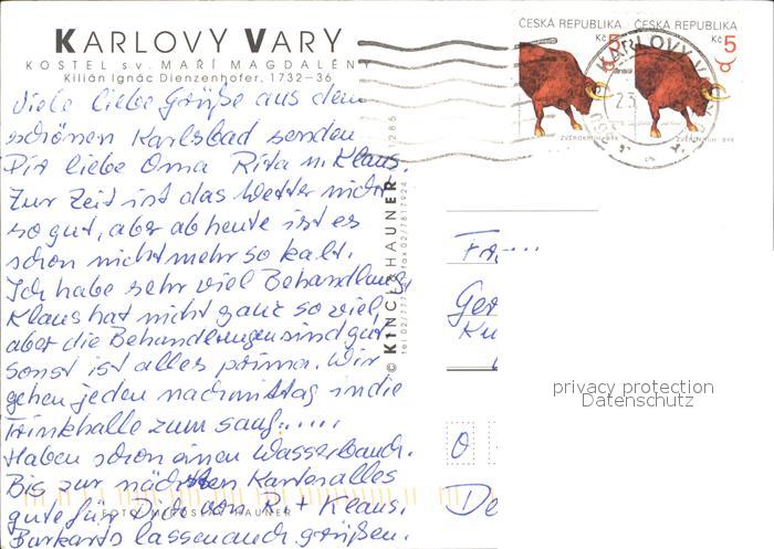 old postcard Karlovy Vary Kostel Maria Magdalena postalisch gelaufen Erhaltung siehe scans