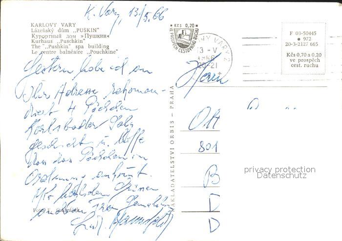 old postcard Karlovy Vary Kurhaus Puschkin postalisch gelaufen Erhaltung siehe scans