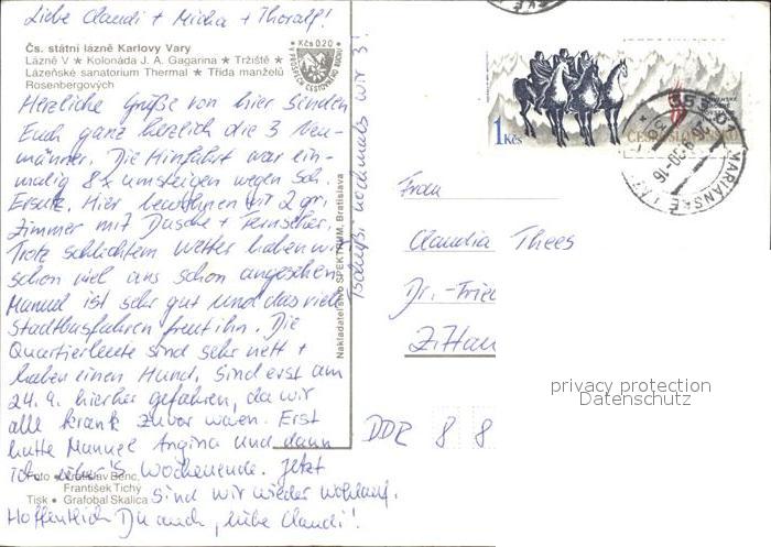 old postcard Karlovy Vary Lazne V Kolonada Gagarina Trziste Lazenske sanatorium Thermal Trida manzeluRosenbergovych postalisch gelaufen Erhaltung siehe scans