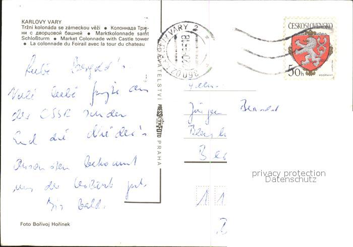 old postcard Karlovy Vary Marktkolonade Schlossturm postalisch gelaufen Erhaltung siehe scans