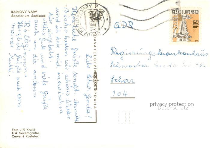 old postcard Karlovy Vary Sanatorium Sanssouci Restaurant postalisch gelaufen Erhaltung siehe scans [FriedD77]