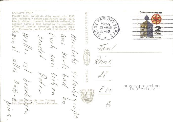old postcard Karlovy Vary Teilansichten Eger Bruecke Hotel Imperial Kolonnade postalisch gelaufen Erhaltung siehe scans