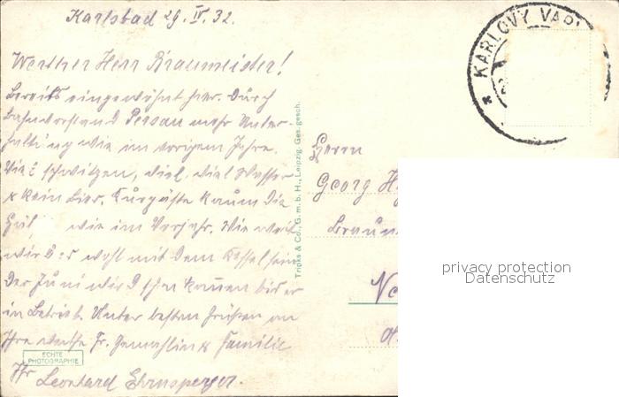 old postcard Karlsbad Eger Becherplatz mit Stadttheater postalisch gelaufen Erhaltung siehe scans
