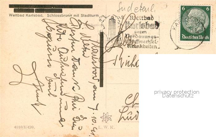 old postcard Karlsbad Eger Marktbrunnen mit Stadtturm postalisch gelaufen Erhaltung siehe scans [FriedD77]