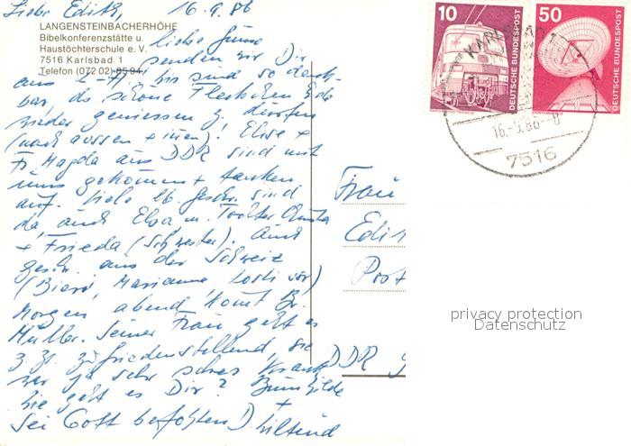 73645001 alte Postkarte Karlsbad Karlsruhe Langensteinbacherhoehe Bibelkonferenzstaette postalisch gelaufen Erhaltung siehe scans [WerneD78] KatCode: 11110008215096