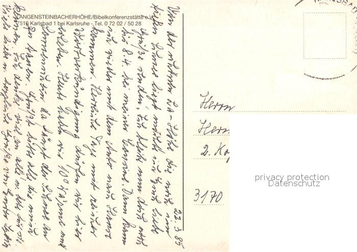 73650233 alte Postkarte Karlsbad Karlsruhe Langensteinbacherhoehe Bibelkonferenzstaette e.V. postalisch gelaufen Erhaltung siehe scans [FriedD77] KatCode: 11110008215096