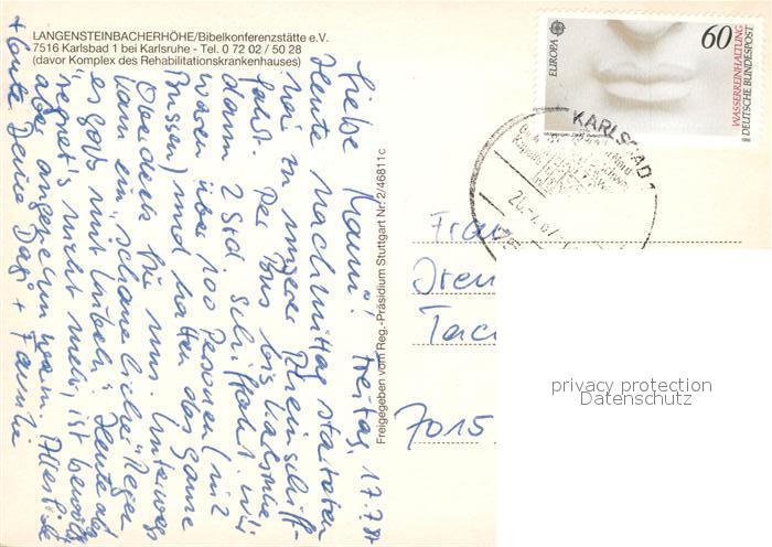 72970288 alte Postkarte Karlsbad Karlsruhe Langensteinbacherhoehe Bibelkonferenzstaette Fliegeraufnahme postalisch gelaufen Erhaltung siehe scans [FriedD77] KatCode: 11110008215096
