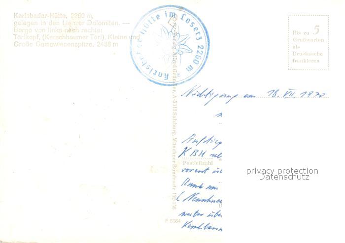 73236488 Karlsbader Huette Dolomiten Toerlkopf Gamswiesenspitze postalisch nicht gelaufen Erhaltung siehe scans [LiesaD40] KatCode: 11390333070732
