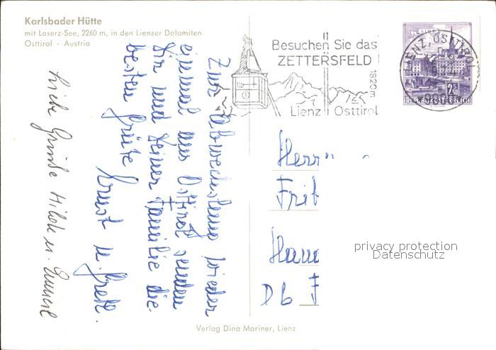 72455035 alte Postkarte Karlsbader Huette Laserz See Bergsee Lienzer Dolomiten postalisch gelaufen Erhaltung siehe scans KatCode: 11390333070732