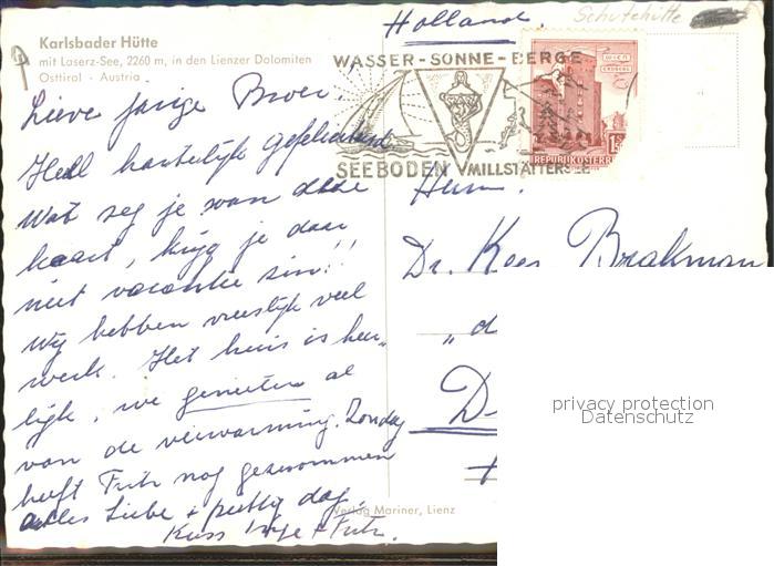 71566873 alte Postkarte Karlsbader Huette mit Laserz See Schutzhaus Lienzer Dolomiten postalisch gelaufen Erhaltung siehe scans KatCode: 11390333070732