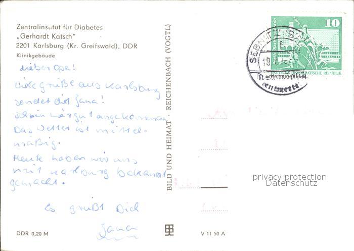 72195992 alte Postkarte Karlsburg Greifswald Diabetesklinik Gerhardt Katsch postalisch gelaufen Erhaltung siehe scans KatCode: 11110013059037