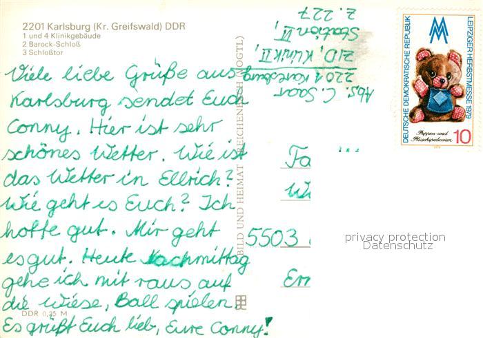 73295060 alte Postkarte Karlsburg Greifswald Klinikgebaeude Barock Schloss Schlosstor postalisch gelaufen Erhaltung siehe scans [WerneD78] KatCode: 11110013059037