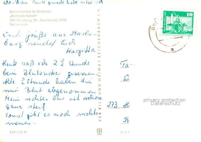 73098502 alte Postkarte Karlsburg Greifswald Zentralinstitut Diabetes postalisch gelaufen Erhaltung siehe scans [KathaD81] KatCode: 11110013059037
