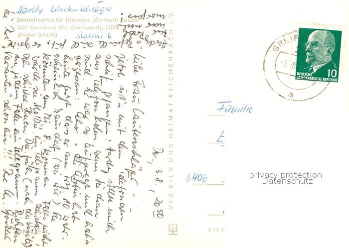 73094143 alte Postkarte Karlsburg Greifswald Zentralinstitut fuer Diabetes Gerhadt Katsch postalisch gelaufen Erhaltung siehe scans [LiesaD40] KatCode: 11110013059037
