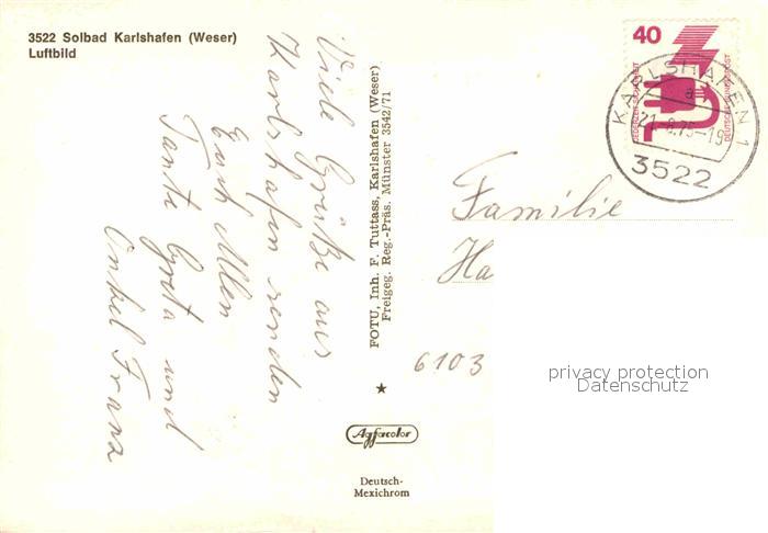 72780141 alte Postkarte Karlshafen Bad Fliegeraufnahme postalisch gelaufen Erhaltung siehe scans [FriedD77] KatCode: 11110006633002