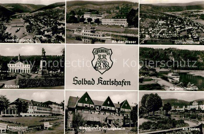 72706527 alte Postkarte Karlshafen Bad Rathaus Weserpartie Fliegeraufnahme Hugenottenturm Hafen Eisenbahn-Erholungsheim Sanatorium postalisch gelaufen Erhaltung siehe scans [LiesaD40] KatCode: 11110006633002