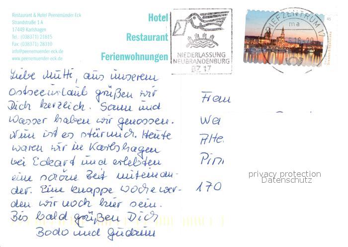 73651365 alte Postkarte Karlshagen Restaurant Hotel Peenemuender Eck Terrasse Strand Zimmer postalisch gelaufen Erhaltung siehe scans [WerneD78] KatCode: 11110013059038