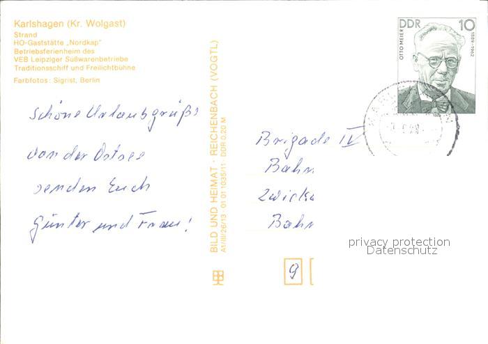 72332261 alte Postkarte Karlshagen Strand HO Gaststaette Nordkap Betriebsferienheim Traditionsschiff Freilichtbuehne postalisch gelaufen Erhaltung siehe scans KatCode: 11110013059038