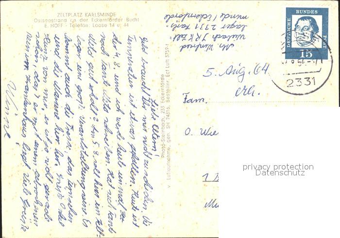 72396423 alte Postkarte Karlsminde Fliegeraufnahme Zeltplatz Eckernfoerder Bucht postalisch gelaufen Erhaltung siehe scans KatCode: 11110001058166