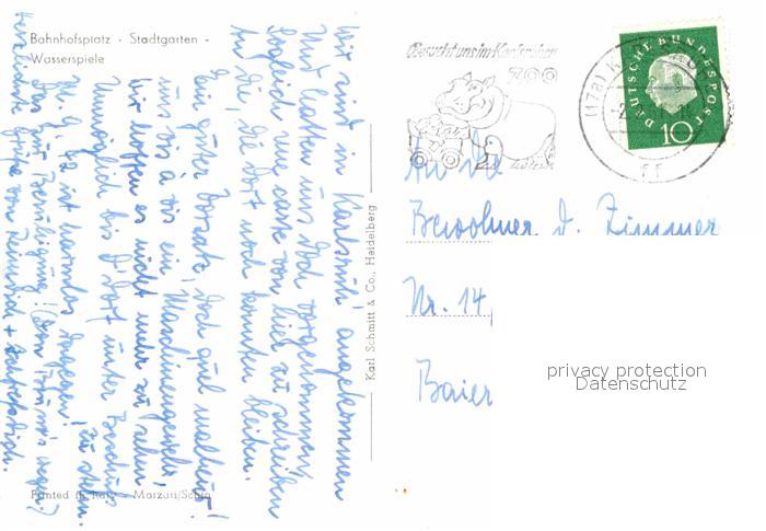 72845064 alte Postkarte Karlsruhe Baden Bahnhofsplatz Stadtgarten Wasserspiele Denkmal postalisch gelaufen Erhaltung siehe scans [FriedD77] KatCode: 11110008212000