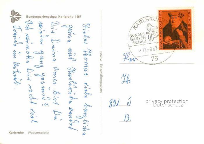72775555 alte Postkarte Karlsruhe Baden Bundesgartenschau 1967 postalisch gelaufen Erhaltung siehe scans [KathaD81] KatCode: 11110008212000