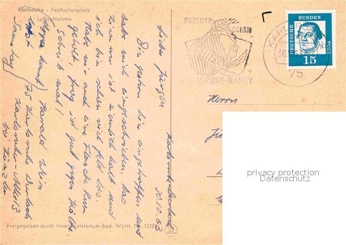 72797756 alte Postkarte Karlsruhe Baden Festhallenplatz Fliegeraufnahme postalisch gelaufen Erhaltung siehe scans [FriedD77] KatCode: 11110008212000