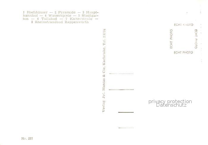 73334695 Karlsruhe Baden Hochhaeuser Pyramide Bahnhof Wasserspiele Stadtgarten Tullabad Kaiserstrasse Rheinstrandbad Rappenwoerth postalisch nicht gelaufen Erhaltung siehe scans [FriedD77] KatCode: 11110008212000