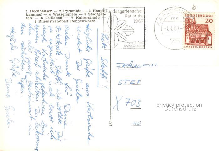 73039432 alte Postkarte Karlsruhe Baden Hochhaeuser Pyramide Hauptbahnhof Wasserspiele Tullabad postalisch gelaufen Erhaltung siehe scans [KathaD81] KatCode: 11110008212000