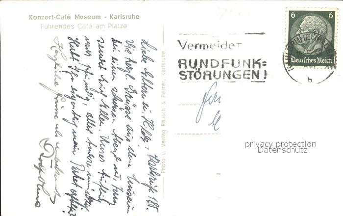 31722527 alte Postkarte Karlsruhe Baden Konzert-Cafe Museum Fuehrendes Cafe am Platze postalisch gelaufen Erhaltung siehe scans KatCode: 11110008212000