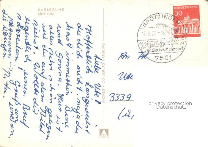 72428810 alte Postkarte Karlsruhe Baden Marktplatz Brunnen postalisch gelaufen Erhaltung siehe scans KatCode: 11110008212000