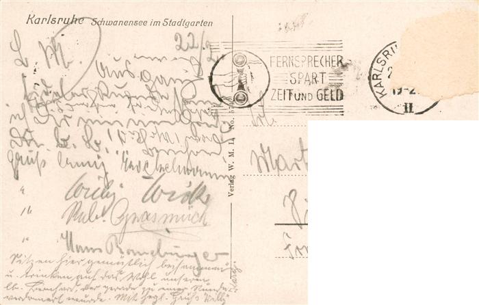 73948838 alte Postkarte Karlsruhe Baden Schwanensee im Stadtgarten postalisch gelaufen Erhaltung siehe scans [FriedD77] KatCode: 11110008212000