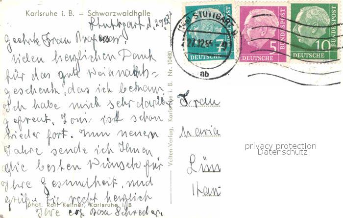 72749181 alte Postkarte Karlsruhe Baden Schwarzwaldhalle postalisch gelaufen Erhaltung siehe scans [AndreD76] KatCode: 11110008212000