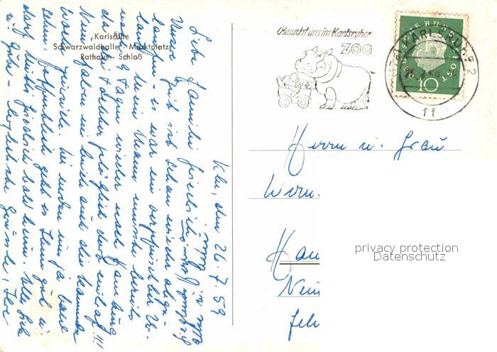 72869393 alte Postkarte Karlsruhe Baden Schwarzwaldhalle Marktplatz Rathaus Schloss postalisch gelaufen Erhaltung siehe scans [NatalD47] KatCode: 11110008212000