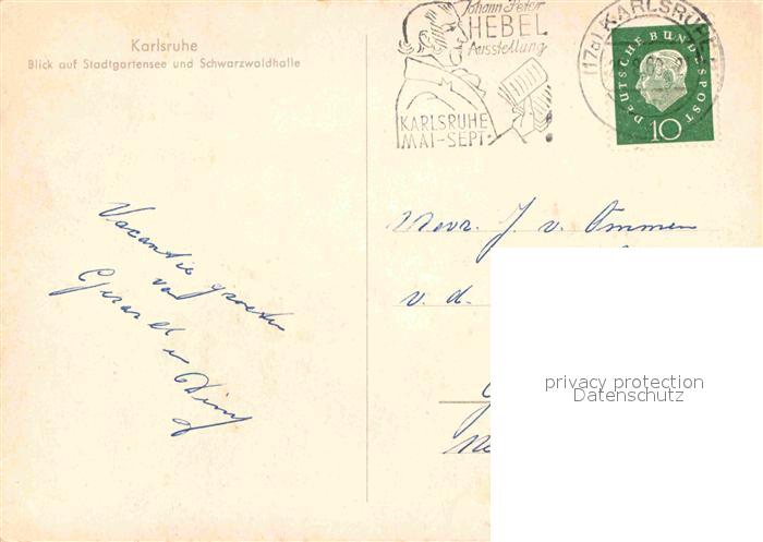 72798669 alte Postkarte Karlsruhe Baden Stadtbild mit Stadtgartensee Schwarzwaldhalle postalisch gelaufen Erhaltung siehe scans [FriedD77] KatCode: 11110008212000