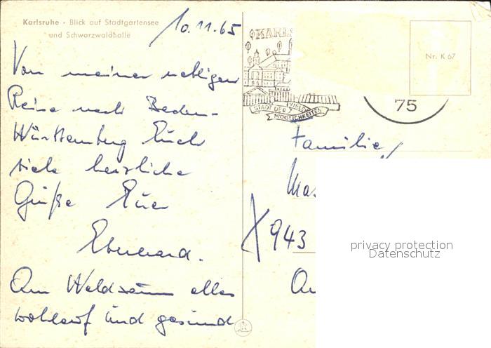 72448588 alte Postkarte Karlsruhe Baden Stadtgartensee Schwarzwaldhalle postalisch gelaufen Erhaltung siehe scans KatCode: 11110008212000