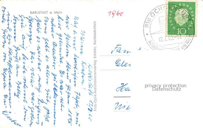 74154236 alte Postkarte Karlstadt Main-Spessart Bayern Uferpartie am Main Blick zur Stadt Wasserspiegelung postalisch gelaufen Erhaltung siehe scans [FriedD77] KatCode: 11110009677148