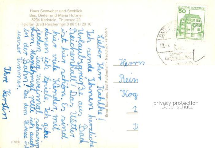 73097838 alte Postkarte Karlstein Oberbayern Haus Seeweber und Seeblick Thumsee Tennis Hallenbad Reiten postalisch gelaufen Erhaltung siehe scans [WerneD78] KatCode: 11110009172114