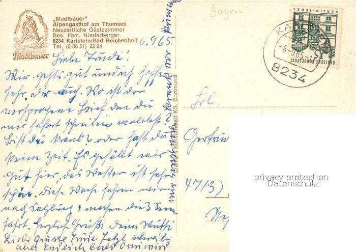 73654682 alte Postkarte Karlstein Oberbayern Madlbauer Alpengasthof am Thumsee Liegewiese Panorama Alpen postalisch gelaufen Erhaltung siehe scans [FriedD77] KatCode: 11110009172114