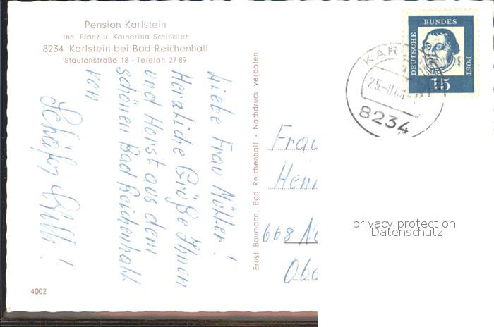 72150469 alte Postkarte Karlstein Oberbayern Pension Karlstein Ortsblick postalisch gelaufen Erhaltung siehe scans KatCode: 11110009172114