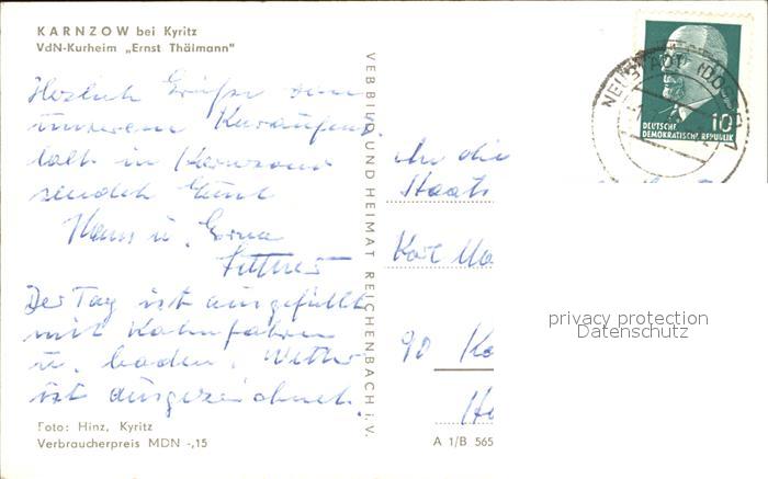 alte Postkarte Karnzow bei Kyritz Kurheim Ernst Thaelmann postalisch gelaufen Erhaltung siehe scans